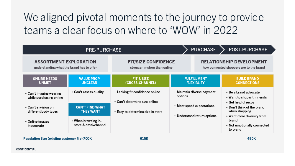 When we started, the challenges were clear but complex. Customers were struggling to navigate their shopping experiences, both in-store and online. They couldn’t find what they were looking for, lacked confidence in fit and sizing, and often felt disconnected from the brand on an emotional level. Nearly 40% of our audience believed our clothing wasn’t worth the price, which created a significant barrier to loyalty.