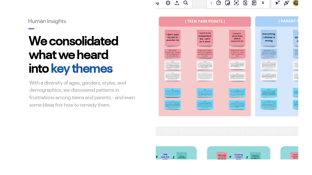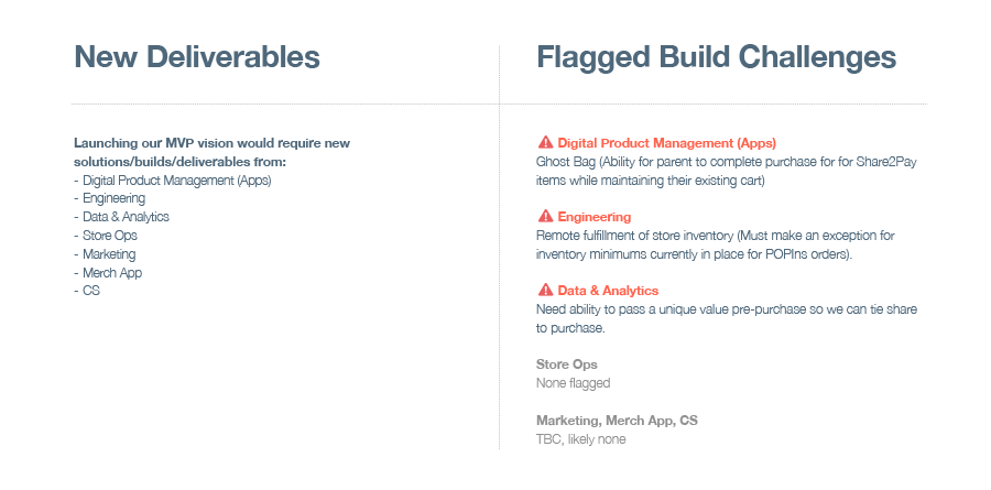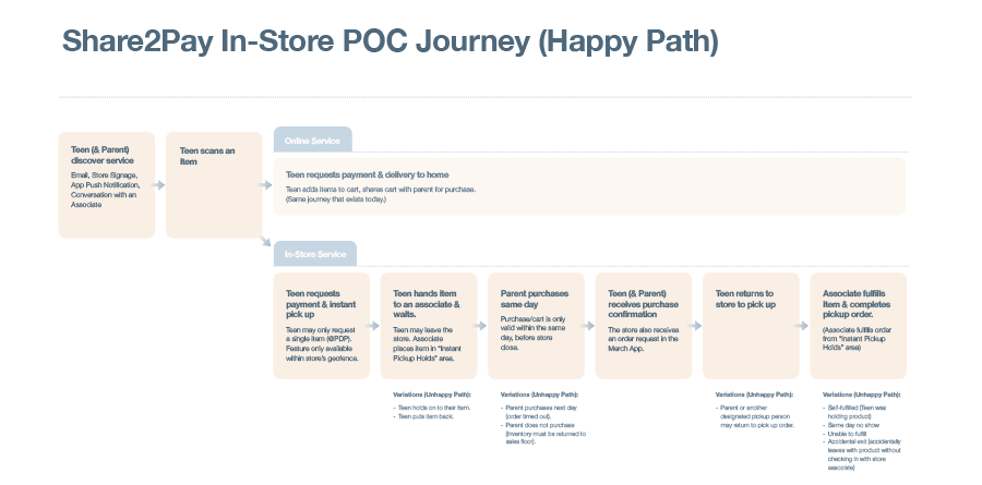 At the end of the engagement, we were able to successfully hand off our MVP journey concept, risk & solution assessment, timeline and visioning themes for future evolutions of teen and parent shared-purchasing experiences.