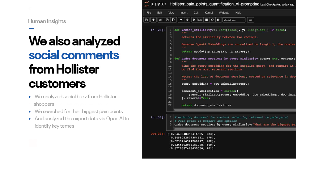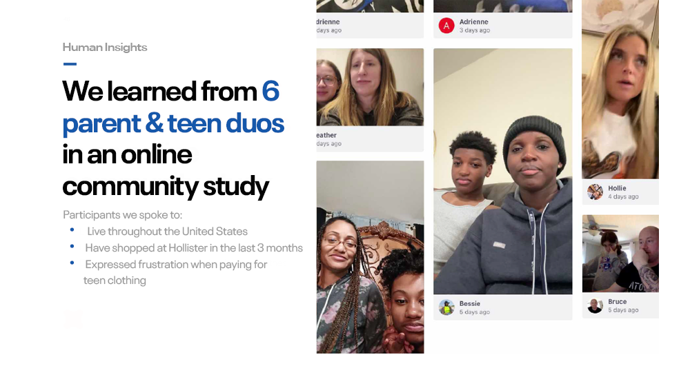 Insights: To gather deep insights, we applied a "Think Beyond" process to co-create the Share2Pay experience with existing Hollister customers. We recruited 6 parent & teen duos for an online community study. Participants we spoke to lived throughout the United States, had shopped at Hollister in the last 3 months, and expressed frustration when paying for teen clothes. Next, we gathered social comments from Hollister shoppers, looking for their biggest pain points. This exported data was then analyzed via Open AI to identify patterns.